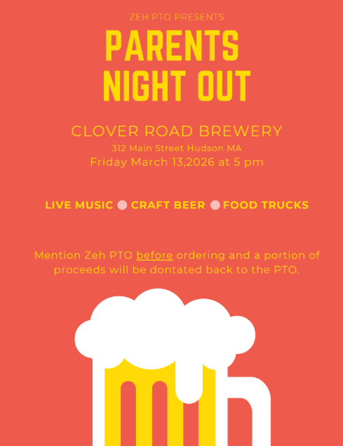 Parents’ Night Out at Clover Road Brewing Company (3/13): It’s been a long winter and we all deserve a break! All Zeh parents are invited to come and unwind at our PTO Parents’ Night Out event at Clover Road Brewing Company in Hudson. The event starts at 5pm, and will feature musical bingo, craft beer, and food trucks. Mention Zeh before you order and a portion of the proceeds will come back to Zeh. See you there!