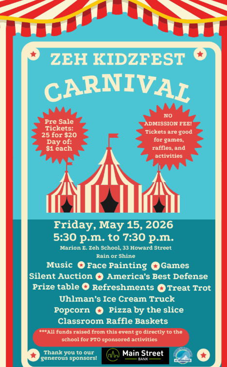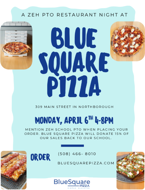 Blue Square Pizza Fundraiser (4/6): Like delicious pizza? Need a break from cooking the day after Easter? The PTO has you covered! Order from Blue Square Pizza on Monday 4/6 between 4-8pm, and a portion of the proceeds goes to Zeh. Make sure to mention Zeh School when you place your order!